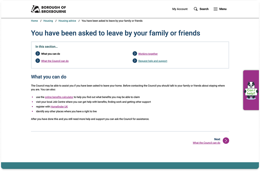 Using the key insights as a basis for the next round of prototyping, I adopted Broxbourne’s new brand identity to customise the look and feel, while maintaining the accessible nature of the components. I added a short questionnaire into the journey, which would only provide information that matched the users situation and reduced the amount of information they had to filter through.