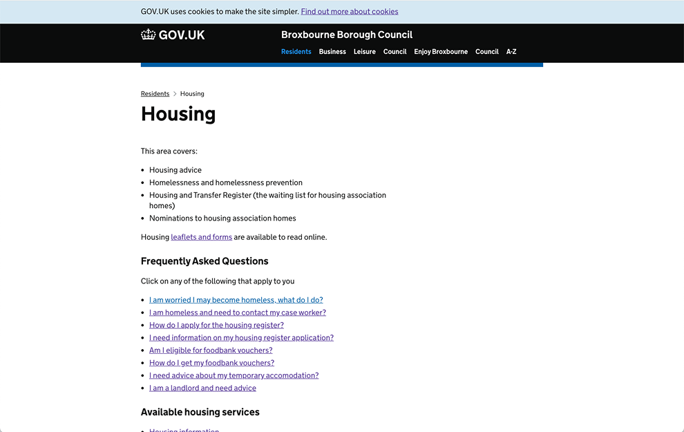 As Broxbourne’s digital capability wasn’t at the right level at the time. the process for users was to get brochures from the council or download multiple PDF’s which were confusing and didn’t really apply to their situation, which in turn frustrated them and therefore needed to contact the council for guidance.